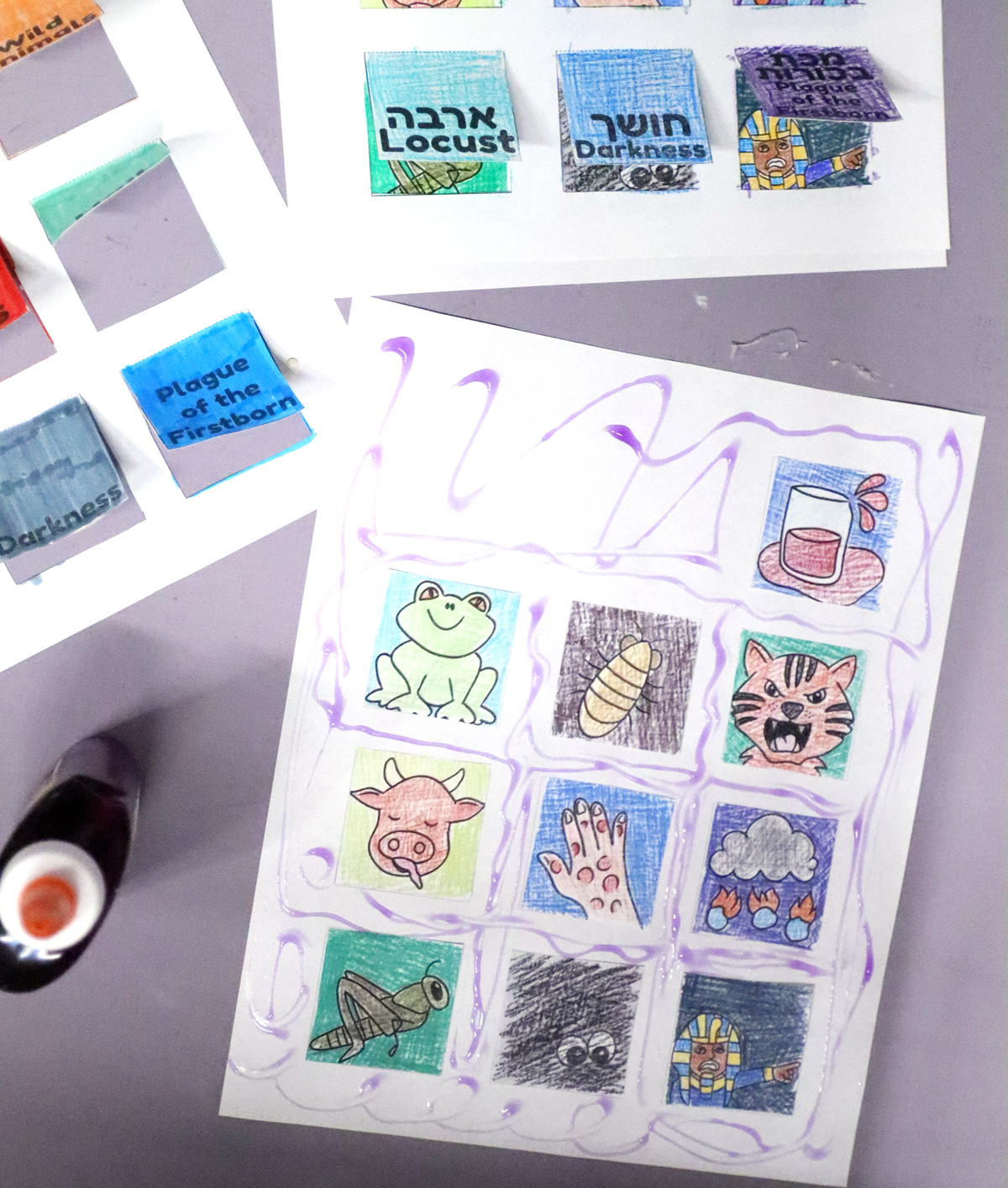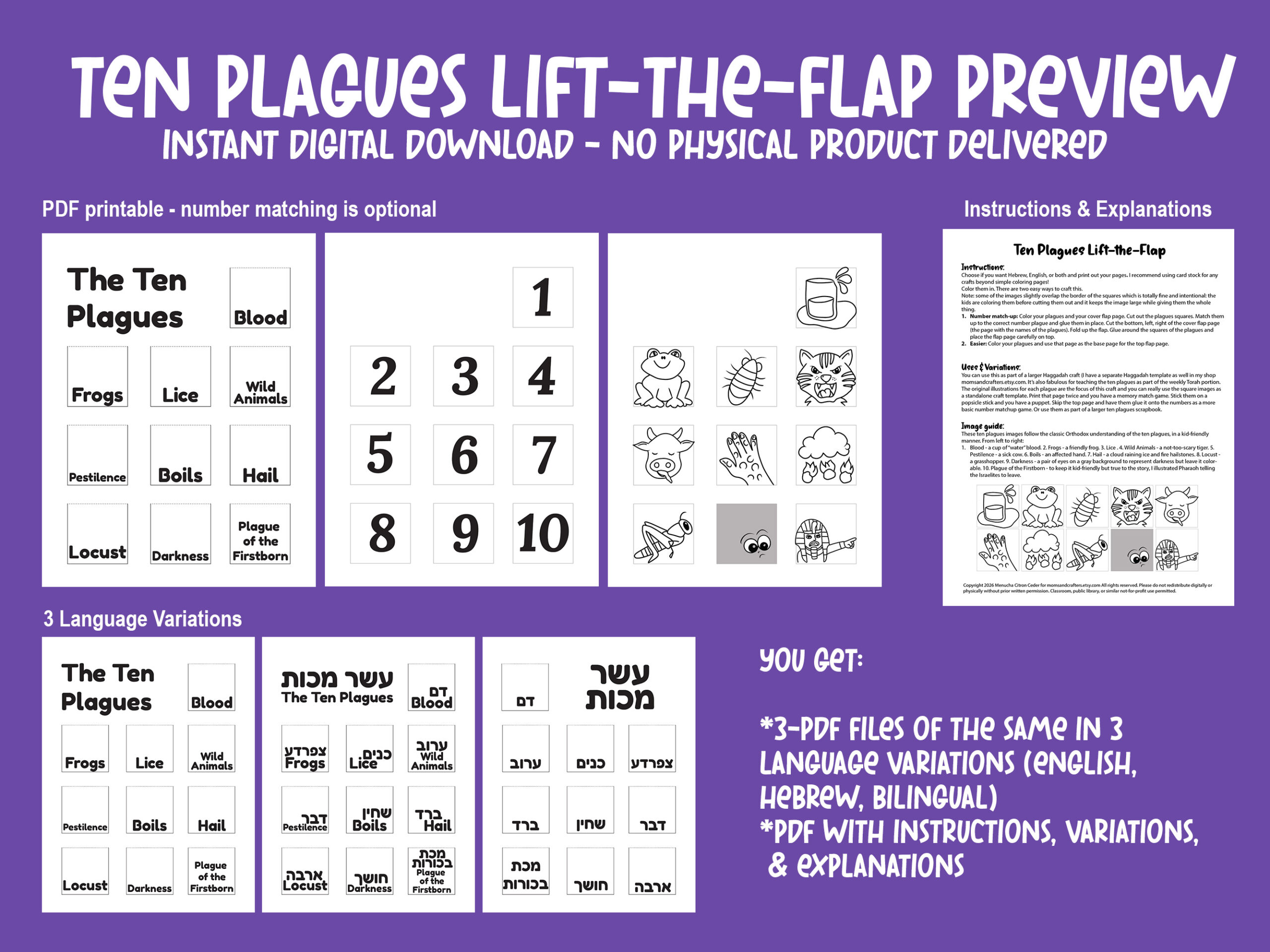 3. Full craft with Bilingual Hebrew-English cover (cover with flaps, plagues coloring page, numbered page. Formatted for left-to-right reading. )