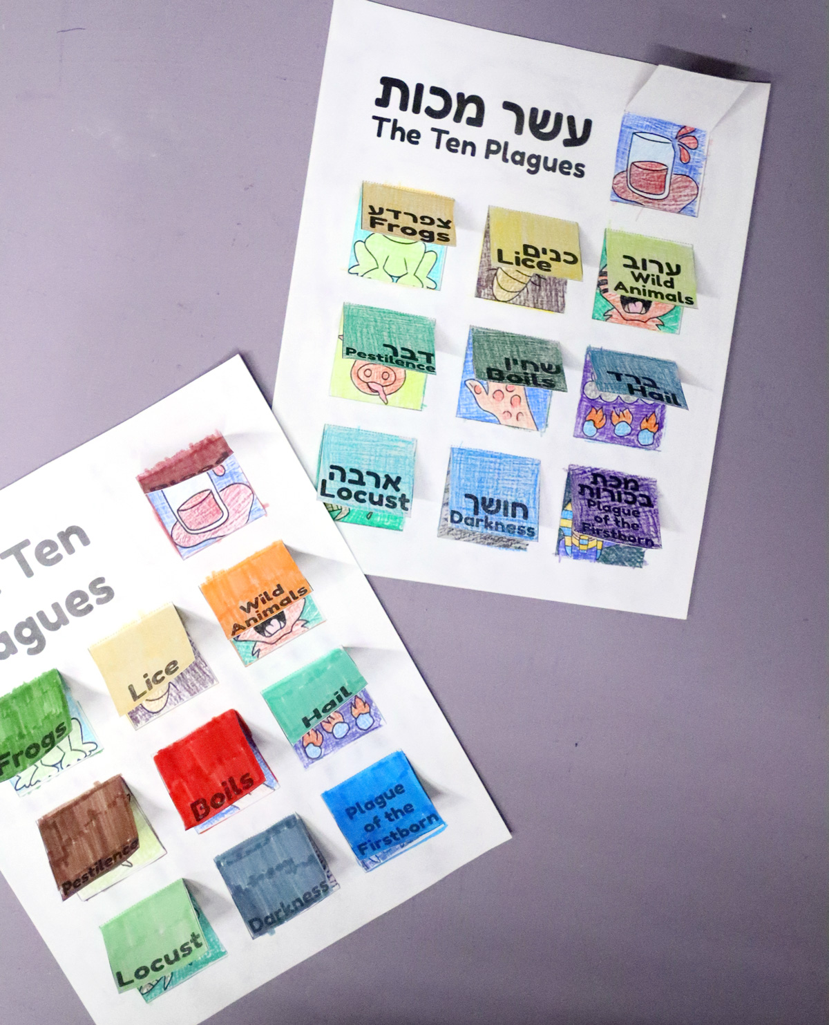 1. Full craft with Hebrew cover (cover with flaps, plagues coloring page, numbered page. Formatted for right-to-left reading.)